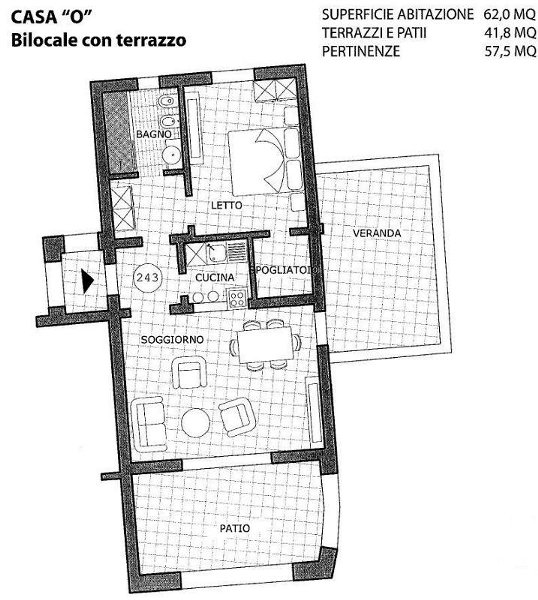 Bilocale con angolo cottura situato in un bel contesto residenziale con piscina condominiale fruibile da tutti gli ospiti. Dispone di una camera da letto matrimoniale con cabina armadio e di un divano letto nella zona giorno che si apre su un patio e su un terrazzo con vista panoramica sul mare. Grazie alla sua posizione, comodissimo è l’accesso alla spiaggia. Non lontano dalle utenze primarie che sono a pochi minuti di auto, è adatto a coppie e a famiglie con bambini.